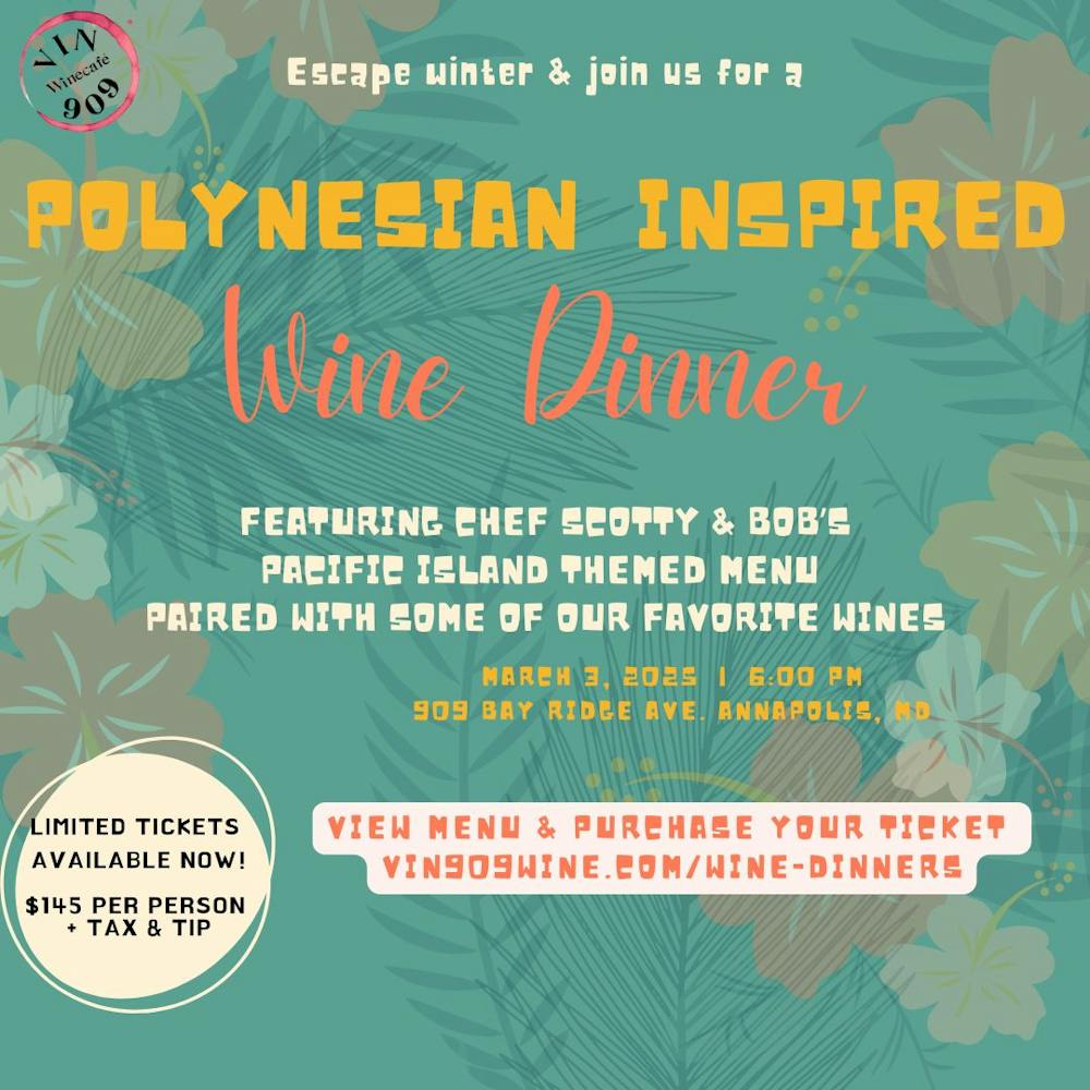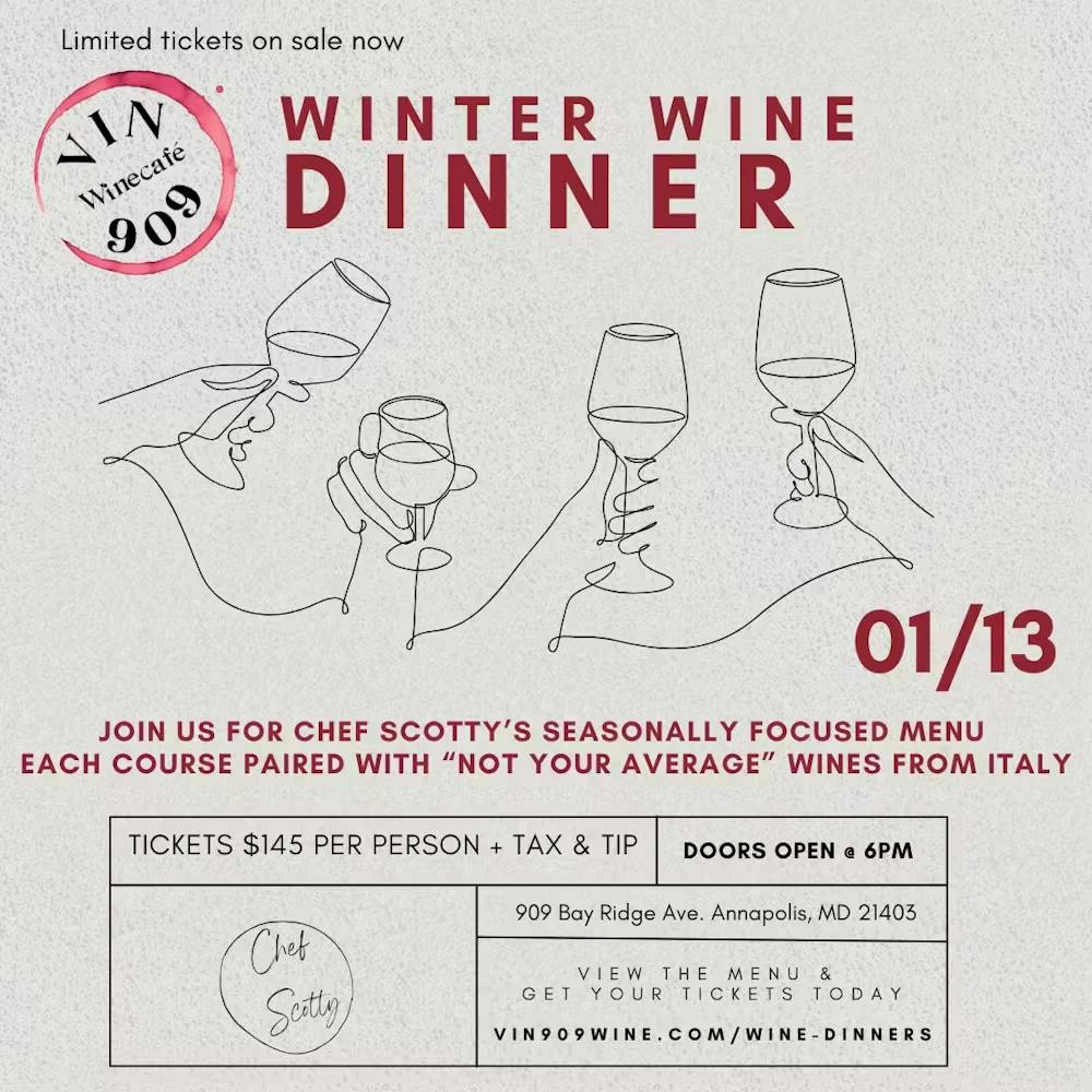 Vin 909 recommends that you review the wine dinner menu prior to purchasing a ticket. We are unable to make substitutions to our Wine Dinner menu and invite you to check back for future wine dinner menus that may more align with your tastes. You can always visit us and enjoy our regular menu of course!